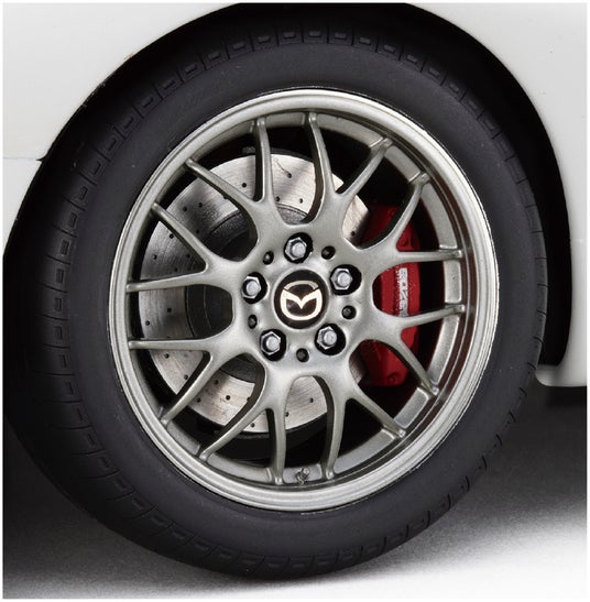 スピリットR独自のBBS社製17インチアルミホイールも細部にわたって忠実に再現。内部には赤いブレーキキャリパーを持つ、ベンチレーティッドディスクブレーキが覗く。6つのテーマでRX-7を深堀するマガジン