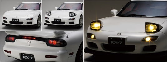 ■ライトとサウンドギミックも搭載 リモコン操作によりRX-7を象徴するリトラクタブルヘッドライトの開閉、点灯が可能。ウインカーやブレーキランプ、テールライトも実車さながらに点灯する。