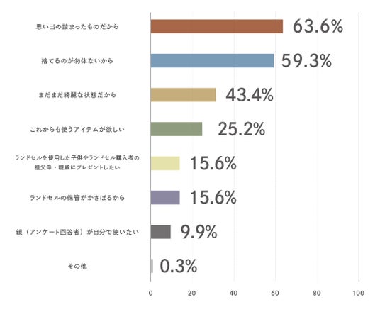 ランドセルのリメイクサービスがあれば利用したいですか」という問いに対し、「はい」が54.2%、「いいえ」が43.0%となりました。理由としては「思い出の詰まったものだから」が63.6%と最も多く、ついで「捨てるのが勿体ないから」59.3%、「まだまだ綺麗な状態だから」43.4%と続きました。使い終えたランドセルも大事にし、使い続けたいと感じている方が多いようです。