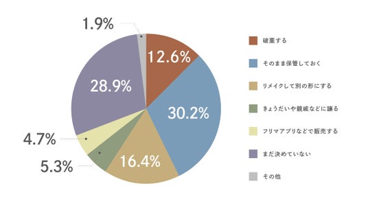 「そのまま保管しておく」が30.2%と最も多く、ついで「まだ決めていない」が28.9%、「リメイクして別の形にする」が16.4%、「きょうだいや親戚などに譲る」が5.3%となりました。