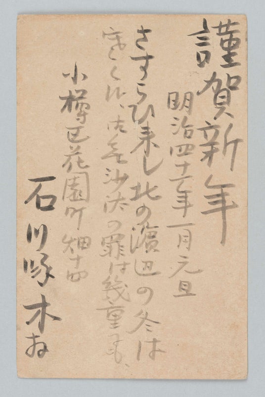 石川啄木筆 金田一京助宛年賀状 明治41年1月1日:北海道・小樽から、盛岡中学の先輩だった言語学者・金田一京助に宛てたもの。