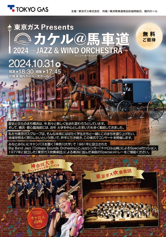 東京ガス株式会社(社長:笹山 晋一)は、10月31日、地域共創の取組の一環として、横浜市地元大学との共創コンサート『カケル@馬車道2024 JAZZ&WINDORCHESTRA』を開催します。