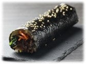 ミンチ、ナムル(人参・ほうれん草・豆もやし・ぜんまい)、キムチ、ゴマの7種の具。当社の運営する牧場直営焼肉店“三代目下村牛”の人気メニューをキムパ風にまとめました。食感と風味が楽しめる一品です (コチュジャン付)。※直径4.5cm ×16cm