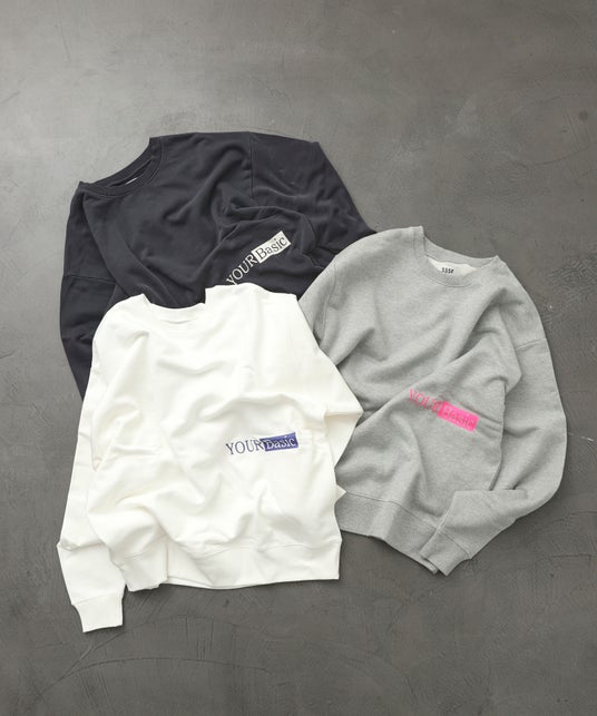 古着のミスプリントから着想を得たデザインは、あえて違和感のある位置に“YOUR Basic” のプリントを施すことで、キャッチーなデザインにしました。ホワイト・グレーは、発色の良いブルー・ネオンピンクのプリントで重たくなりがちな冬のコーディネートのポイントに。チャコールグレーは退色させた雰囲気を出すために、ロゴはビンテージホワイト、ボディはピグメント加工をかけ、より古着感を演出しています。程よいリラックス感で着用できるオリジナルのボックスシルエットタイプのボディです。