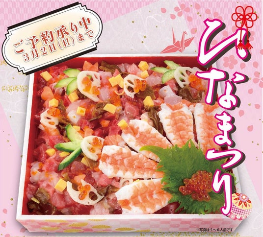 女の子の健やかな成長と幸せを願う日本の伝統行事「桃の節句」と言えば、お雛様や菱餅と並び、ちらし寿司を食べるのが定番です。『サカナタベタイ』では、産地とのネットワークや東京・豊洲市場での仕入れ力を駆使し、当社自慢の目利きが厳選した海鮮たっぷりの贅沢な海鮮を使用したひな祭り限定のちらし寿司を2店舗でそれぞれ販売いたします。2人前から5~6人前までお用途に応じてサイズをお選びいただけますので、ひなまつりのお祝いに、魚屋さんのこだわりが詰まった豪華な「海鮮ちらし寿司」をぜひご賞味ください。
