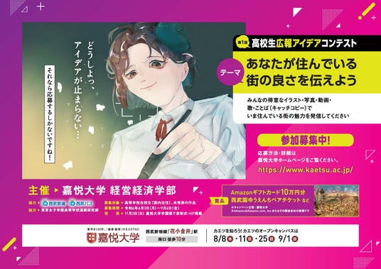 嘉悦大学(東京都小平市/学長:森本 孝)は、今年、国内の高校生を対象に、未来の“広報クリエイティブ人材”の育成を支援するための「第1回高校生広報アイデアコンテスト」(協力:西武鉄道、西武バス、東京女子学院高等学校漫画研究部)を実施し、全国から全38点の応募作品が集まりました。厳正な審査の結果、このたび入賞作品が決定し、本日11月3日(日)に表彰式を実施しましたので、お知らせいたします。