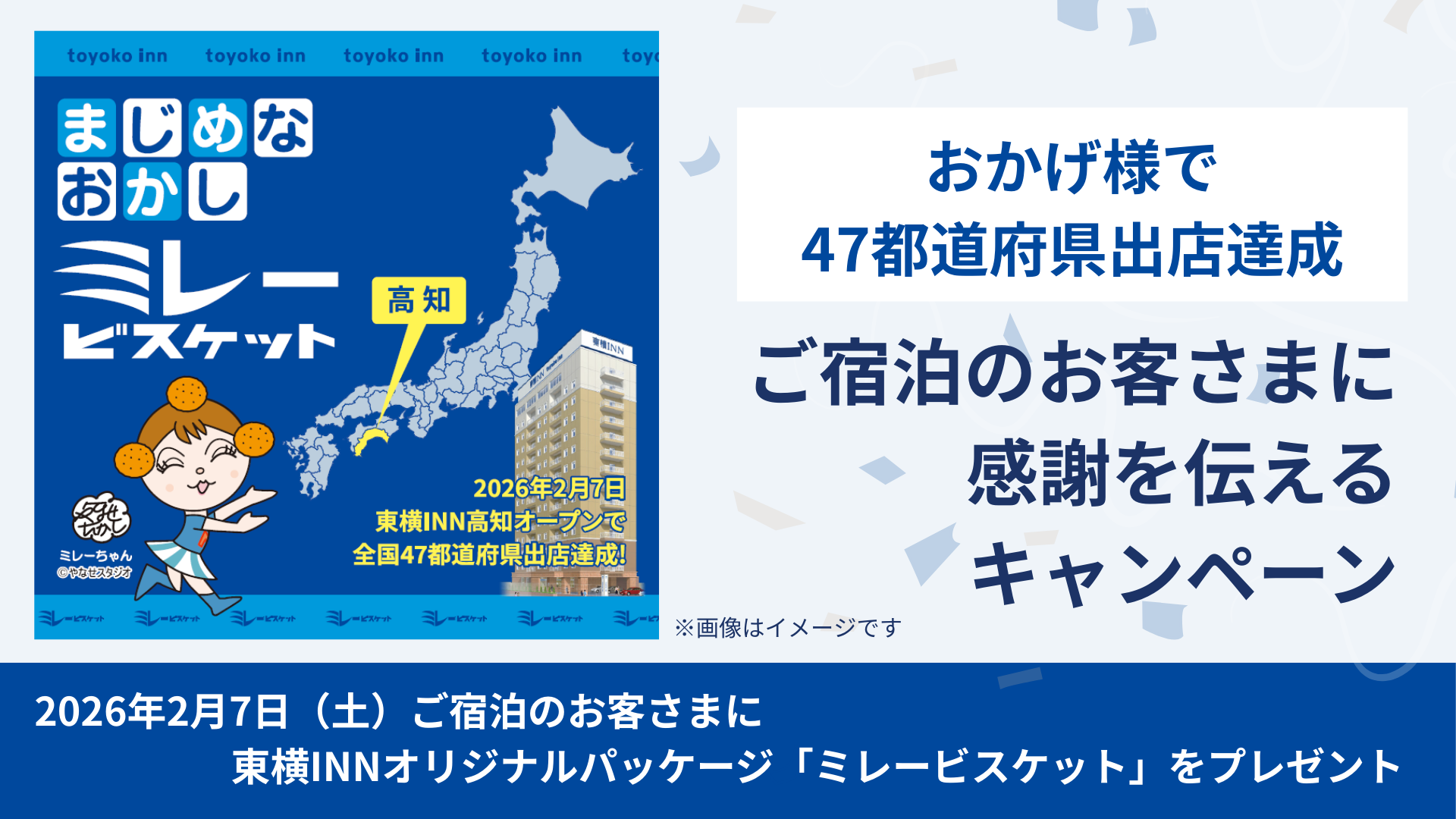 2026年2月7日(土)、株式会社東横インは「東横INN高知」オープンにより全国47都道府県への出店を達成します。これを記念して、2月7日に国内すべての東横INNにご宿泊のお客さまに先着で、高知県のお菓子「ミレービスケット」をプレゼントいたします。