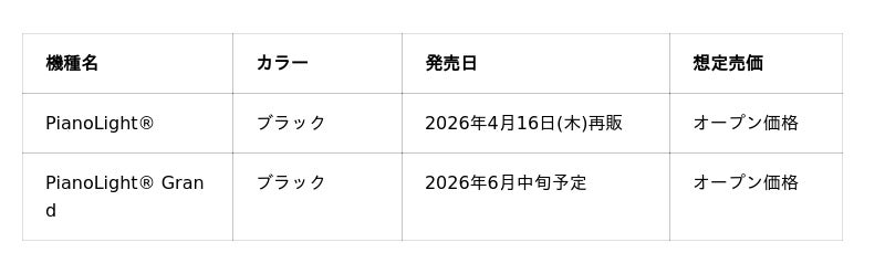 「PianoLight(R)」「PianoLight(R) Grand」製品仕様表