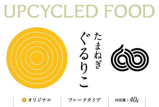 『タマネギぐるりこ』は、タマネギの芯、表面の硬い部分、スライス時のサイズの規格外品が原料となっており、100%タマネギ由来の乾燥タマネギフレークです。原料となっているタマネギの端材は、大手牛丼チェーンの野菜加工センターで牛丼用のタマネギを下処理する際に発生したものになっており、おいしくエシカルなアップサイクルフードです。