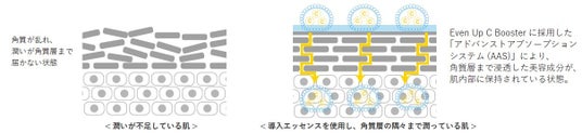 導入エッセンスは、その後塗布する美容成分を受け入れやすい状態に整えてくれる役割を担っています。朝晩の洗顔後、化粧水の前に使用すると美容成分がなじみやすい肌に整うのを助け、その後のスキンケアの美容効果を感じやすくする働きがあります。いつものスキンケアに慣れていると初めは戸惑うかもしれませんが、肌が乾燥に傾いているときこそ、Even Up C Booster がもたらすインパクトは大きいと考えます。