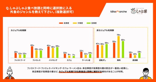 ・来店頻度が高い層は低い層と比較し、カジュアル利用できる飲食店と同時にしゃぶしゃぶ食べ放題を検討する割合が高い傾向にある