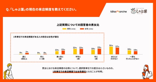 1年単位での来店頻度がある人の割合は、女性が優位という結果になりました。