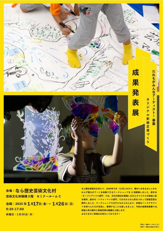 なら歴史芸術文化村では、年齢や障がいの有無にかかわらず、だれもがアートに親しむきっかけや芸術文化活動に参加しやすい環境を提供し、アートの楽しみを発見することや、自己表現ができる機会を創出するため、「だれもがみんなアーティスト!事業」ワークショップを令和6年9月から12月にかけて開催したところです。