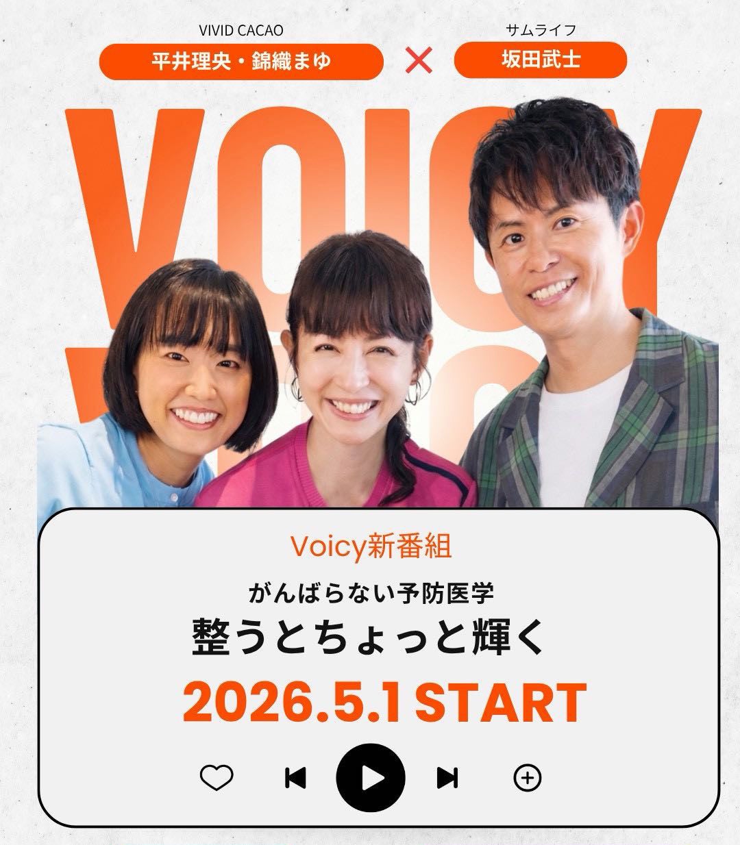 「なんとなく不調」を、前向きな日常へ。予防医学の第一人者・坂田武士が、VIVID CACAO代表・平井理央、錦織まゆと共にVoicyで新番組『がんばらない予防医学』を5月1日始動!