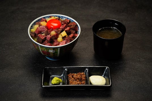 自家製ローストビーフを器からあふれる大きさにスライスし、たっぷりと敷き詰めました。卵黄とからめてお召し上がりください。
