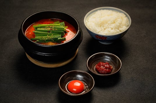 贅沢に約21cm(調理前)のコプチャン(牛の小腸)をピリ辛チゲで煮込みました。ぐつぐつ煮えた状態でご提供いたします。別添えの卵黄はチゲに入れても、卵かけご飯にしても良し。