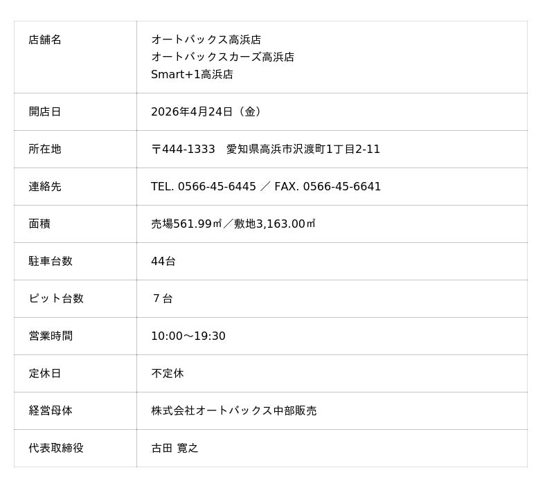 株式会社オートバックスセブン(代表取締役 社長:堀井 勇吾)と加盟店契約を結んでいる株式会社オートバックス中部販売(代表取締役:古田 寛之)は、2026年4月24日(金)に「オートバックス高浜店(たかはまてん)」を新規オープンいたします。併せて、「オートバックスカーズ」「Smart+1」もインショップ・併設店形態で同日オープンいたします。