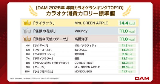~Mrs. GREEN APPLE「ライラック」など、DAM 2025年人気曲 TOP10の消費カロリー標準値を公開~