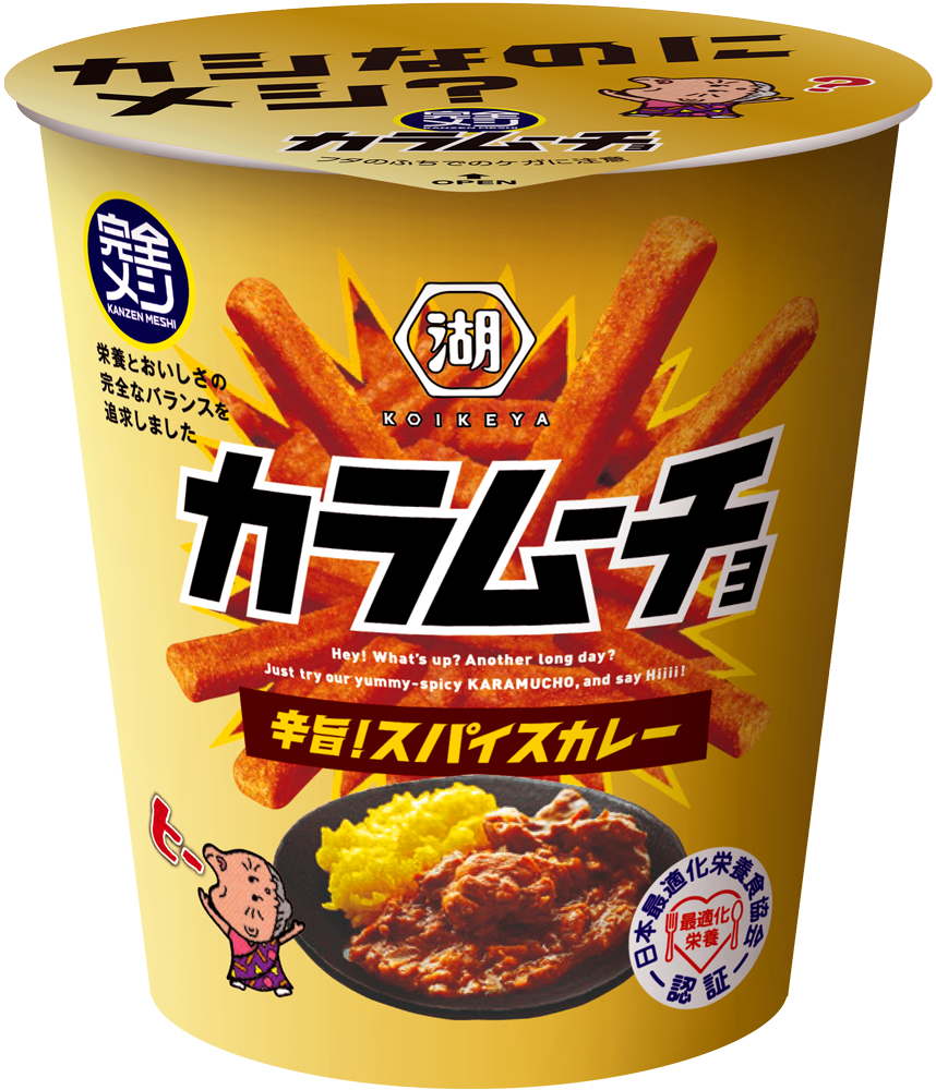 日清食品が展開する「完全メシ」は、「日本人の食事摂取基準」で設定されたビタミン・ミネラルなど33種類の栄養素※1とおいしさの完全なバランスを追求したブランドです。同社の最新フードテクノロジーを駆使することで、たんぱく質、脂質、炭水化物の三大栄養素のほか、ビタミン、ミネラル、必須脂肪酸もバランスよく整え、さらには、栄養素独特の苦みやエグみを抑えることで、普段の食事と変わらないおいしさを実現しています。 湖池屋は、“栄養とおいしさの完全なバランスを追求したスナック菓子”という新たな価値を提供したいとの思いから、日清食品と共同開発した「完全メシ」シリーズ初となるスナック菓子「完全メシ カラムーチョ ホットチリ味」を2023年10月に発売し、多くのお客様にご評価いただきました。 今回発売する「完全メシ カラムーチョ 辛旨!スパイスカレー」は、「カラムーチョ」の辛旨でやみつきなおいしさはそのままに、33種類の栄養素のバランスを適切に調整した“超進化系カラムーチョ”です。 日々の勉強や仕事、家事などでたまったストレスを、当商品を食べることで気持ちよく発散できる味わいを目指し、フレーバーには「スパイスカレー」味を採用。「カラムーチョ」の特徴である辛旨さに、スパイスカレー特有の奥深い香りやコクを重ねました。口に入れた瞬間に広がるスパイスと、後引く旨みを感じられる奥行きのある味わいは、スナックでありながら“食事としての満足感”をお楽しみいただけます。スパイスの香りと辛旨さの絶妙なバランスで、食べ進めるほどにやみつきになる一品です。 栄養とおいしさの完全なバランスを追求した驚きの“発散スナック”を、ぜひお楽しみください。 ■「完全メシ カラムーチョ 辛旨!スパイスカレー」について 「完全メシ カラムーチョ 辛旨!スパイスカレー」は、「カラムーチョ」の辛旨でやみつきなおいしさはそのままに、「日本人の食事摂取基準」で設定されたビタミン・ミネラルなど33種類の栄養素※1とおいしさの完全なバランスを追求した“超進化系カラムーチョ”です。スナック菓子でありながら、たんぱく質、脂質、炭水化物の三大栄養素のバランス(PFCバランス)が整っています。1本ずつ食べやすいスティック形状とカリカリとしたやみつきになる食感が特徴で、オイル掛け・シーズニング掛けの2段階で味付けすることにより濃厚な味わいに仕上げました。カップ型の容器に入っているので、持ち運びやすさも兼ね備えています。 さらに、当商品は「一般社団法人 日本最適化栄養食協会」から主要な栄養素がバランスよく適切に調整された「最適化栄養食」として製品認証※2を受けています。 ※1「日本人の食事摂取基準」(2020年版) において日本人が摂取すべき量が定められたすべての栄養素 ※2 栄養設計基準(登録番号T-001)を満たす製品としての認証。登録番号T-001は、18歳から64歳男女で身体活動レベルI~IIIの方々に適したカロリー当たりの栄養素の上下限値を定めたもので、たんぱく質、脂質、飽和脂肪酸、n-3系脂肪酸、n-6系脂肪酸、炭水化物、食物繊維、ビタミン13種、ミネラル13種、必須アミノ酸9種について上下限値の基準が設定されています。 小腹が空いた時、夜中にもう一品欲しい時。どうせ食べるなら、美味しくて体も喜ぶ“超進化系”を選びませんか?スパイスの力で、溜まったストレスを美味しく吹き飛ばしましょう!■「最適化栄養食」について