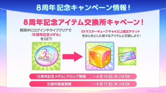 ログインやライブクリアで「8周年記念メダル」を獲得することができ、集めた「8周年記念メダル」を使って交換所で好きなアイテムと交換することができます。