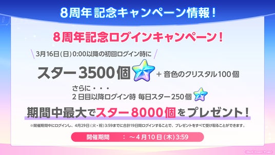 4月10日(木)3時59分までの間に1回ログインし、4月29日(火・祝)3時59分までに合計19日間のログインをすると合計で「スター8000個」「音色のクリスタル100個」を受け取れます。