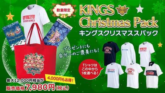 クリスマスパックだけでしか手に入らない選手トートバックを含む、最大総額12,000円相当の商品が入ったお得なグッズセット! Tシャツは6種類の中からお客様のお好きなデザインを選べます。キングスクリスマスパックは数量限定となりますのでぜひお早めにお買い求めください。