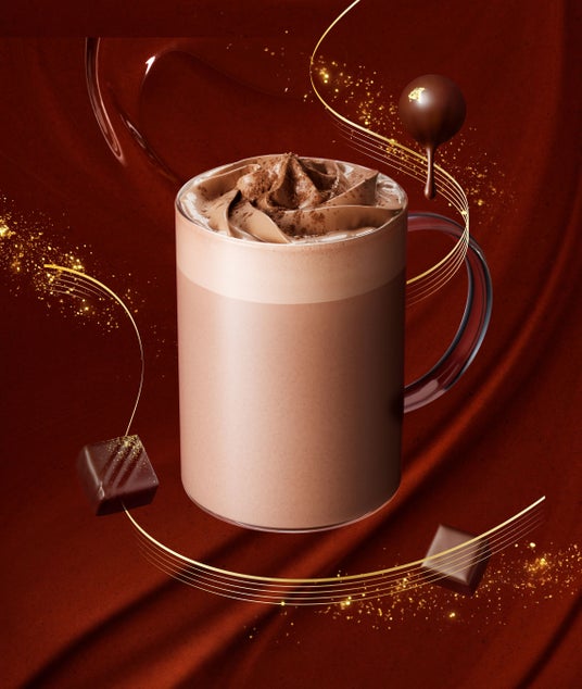 トップには「ふわっ」とした口どけの良いチョコレートホイップとカカオの濃厚な味わいが楽しめるショコラソースをのせ、華やかな一杯の仕上げには、キラキラと輝く金粉パウダーをあしらいました。口の中でやさしくほどけるチョコレートホイップにビターなショコラソースが重なり合います。異なる音色を持つ3つのチョコレートが重なる、スターバックスバレンタインならではの甘いシンフォニーをお楽しみください。