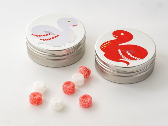 (左)縁起缶キャンディ 白へび/(右)縁起缶キャンディ 紅へび 各1缶 550円/ヒトツブ カンロ