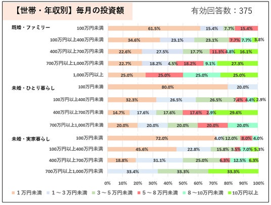 年収別では、年収が高くなる程投資をしている人の割合は高くなる傾向に。さらに特徴的であったのが、年収に関係なく「家計簿をつけている」と回答した人の方が同年収比較で投資をしている割合が高い結果となりました。年収に関係なく、金融知識をもち、自身の家計管理から投資できる余剰資金を把握できているかが投資運用の差に繋がっていると考えられます。また、毎月の投資額では既婚・ファミリー平均38,901円、未婚・ひとり暮らし平均35,513円、未婚・実家暮らし平均27,410円となりました。