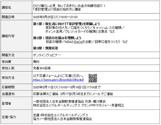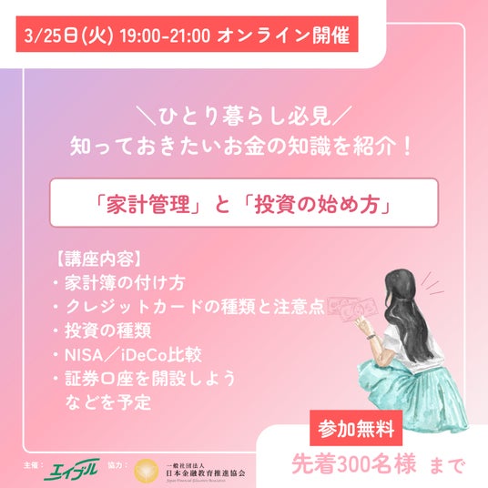 株式会社エイブル(本社:東京都港区、以下エイブル)は、2025年度のグローバルマネーウィークにあわせて、一般社団法人日本金融教育推進協会代表・横川楓氏を講師に招き、これからひとり暮らしを始める新入学生・新社会人に向けて知っておきたいお金の知識を無料で学べるマネー講座を2025年3月25日(火)に開催いたします。