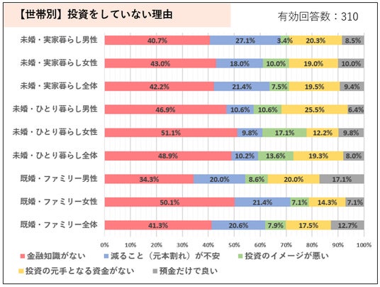 投資経験では既婚・ファミリーが最も高く、未婚・実家暮らしが最も低い結果に。性別で比較すると男性の方が女性より投資経験が高い傾向ですが、未婚・ひとり暮らしのみ男女差は僅差となり、未婚・ひとり暮らしのおよそ半数が現在投資運用していると回答しました。投資をしていない人の投資をしない理由では、「元本割れが不安」、「元手となる資金がない」などの理由も挙がりましたが、圧倒的に多い理由では「金融知識がない」が全体の4割以上、特に未婚・ひとり暮らしでは5割前後と高い結果になりました。