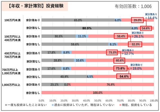 家計簿をつけている人の方が投資をしている割合が最大25%程度高い