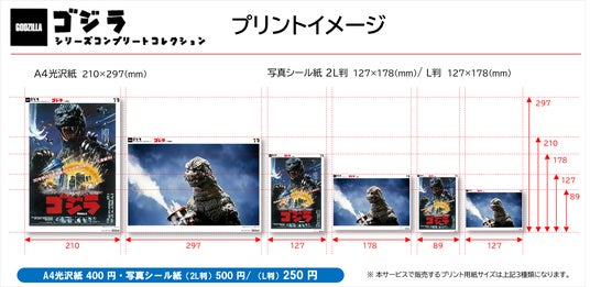 作品全てをまるごと購入できる「コンプリートパック」もさらに使いやすくなりました。 ◆選べる用紙サイズ 【ゴジラ シリーズ コンプリートコレクション】では、作品の魅力を心行くままに楽しんでいただくための最適サイズとして、保存にも掲出にも最適な厚手用紙の「A4光沢紙」と、写真品質で裏面がシール加工されている「写真シール紙(2L判)」「写真シール紙(L判)」の3種類での販売となります。