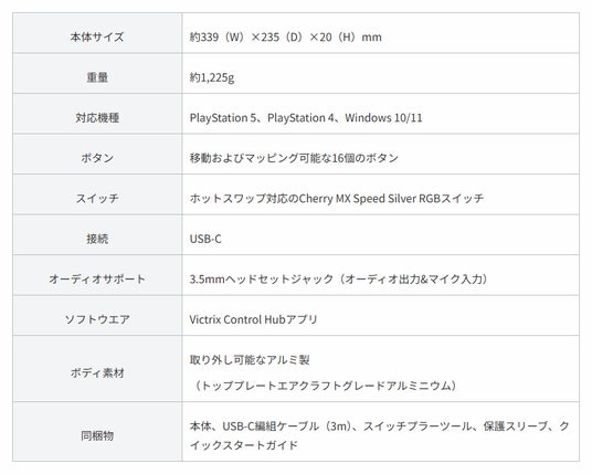 「ストリートファイターIIチャンピオンエディション」とコラボレーションしたアーケードコントローラーは、「EVO Awards 2024※」において「Best Tech Product賞」を受賞したVictrix「Pro KO」をベースに、「ストリートファイターIIチャンピオンエディション」のプレイヤー選択画面をモチーフとした特別デザインモデルです。レバーレス設計に加え、ホットスワップ対応のCherry MX Speed Silver RGBスイッチを搭載し、高速かつ高精度な入力と柔軟なカスタマイズ性を実現。移動とマッピングが可能な最大16個のボタンを備え、対戦を有利に進める操作環境を提供します。ボタン周囲のRGBライトもカスタマイズ可能で、好みに応じた演出を楽しめます。ボタンの配置やスイッチの変更も容易にでき、ニーズに合わせてファイトスティックにカスタマイズできます。さらに、薄型設計ながらスイッチやボタンキャップなどを本体内に収納可能です。ショルダーストラップやハンドルを取り付けるためのマウンティングポストも備えているため、優れた携帯性を実現。カプコンおよびPlayStationの公式ライセンスを取得した、プロレベルの対戦に適した高性能モデルです。