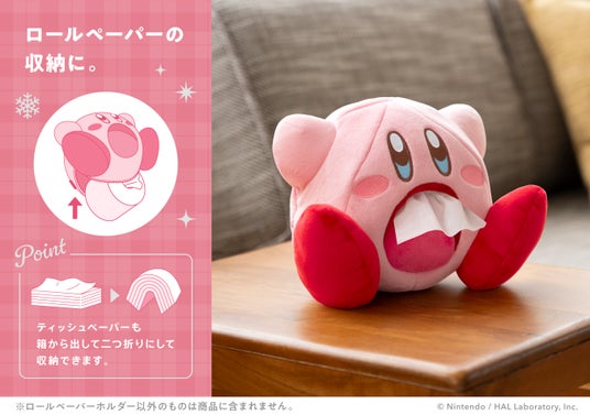 ロールペーパーを手軽に使いやすく収納できるぬいぐるみ風のホルダーです。「カービィ」の口