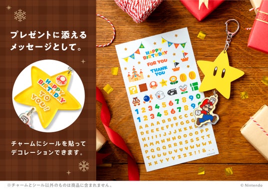 アクリル製のチャームとシールのセットです。数字やアルファベットのシールを組み合わせてチャームに貼ることで、誕生日のお祝いメッセージやネームプレートを作ることができます。