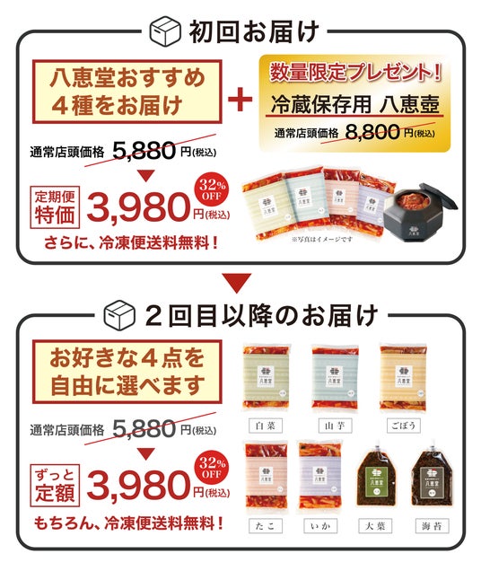 八恵堂では腸活に最適なキムチを、日々の食生活で召し上がっていただきたい。との想いから、とってもお得な定期便を推奨いたしております。