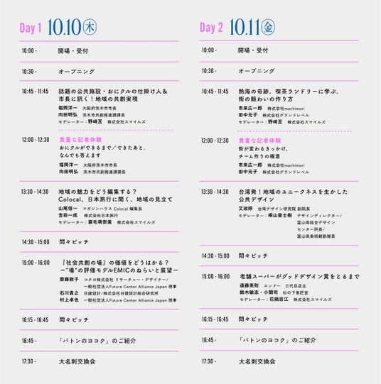 2日間で全6つの「トークセッション」と2つの「貴重な記者体験」をご用意。地域ごとの課題とその解決に向けたアプローチを実践され成果をあげている方々や地域のユニークネスを発見、編集し発信している方など、さまざまなカタチで地域に携わるフロントランナーたちにご登壇いただきます。