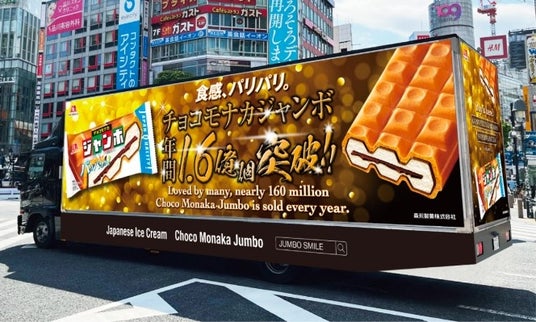 また、8月14日から28日の期間中、日本独自の文化にもなりつつあるゴージャス感満載のアドトラックが、東京・渋谷の街を期間限定で走行します。アドトラックからは軽快な楽曲を流しながら、英語のコピーが入った広告を掲出し、訪日外国人に向けて“ジャパンクオリティ”である「チョコモナカジャンボ」の人気とその魅力をアピールしています。また、8月22日(木)から大阪・戎橋付近にて一週間走行します。