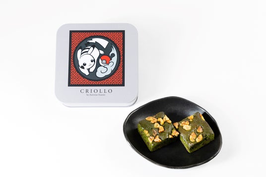 抹茶の味を出すためにホワイトチョコレートを使い、しっとりと焼き上げたブラウニー。こだわりの西尾抹茶を使用し、チョコチップでチョコレート感もプラスしました。「ポケモン×工芸展」の特別な缶に入れてご用意します。
