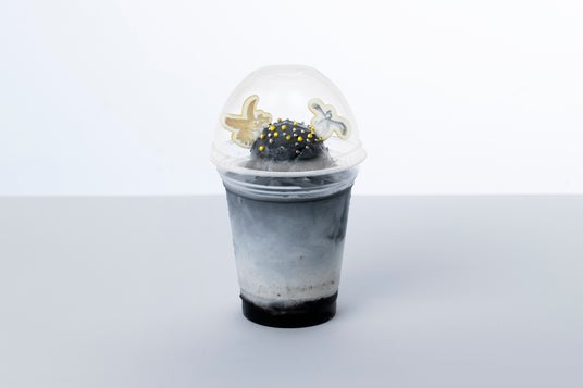 桂盛仁の作品《香合 ホウオウ》《香合ルギア》をイメージし、ゴールドとシルバーのアラザンを散らした黒ゴマのドリンクです。