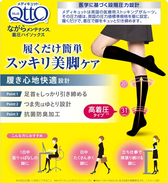 新製品「メディキュット ながらメンテナンス*1 着圧ハイソックス」は、何もしていない時間が脚ケア時間になる、日中どこでも履くだけで簡単にスッキリ美脚ケアができる“ながら” メンテナンス*1製品です。メディキュットは英国の医療用ストッキングがルーツになっており、その圧力値は、英国の圧力値標準規格を基に設定しているため、履くだけで着圧で脚をキュッと引き締めます。