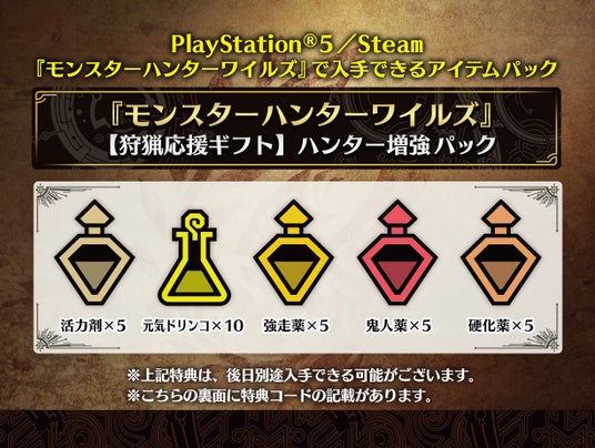 大狩猟展にご来場いただいた方に『モンスターハンターNow』のゲーム内アイテムを入手できるスペシャルプロモーションコードカード、大狩猟展限定のポストカード2枚に加え、PlayStation(R)5 /Steam『モンスターハンターワイルズ』で入手できるアイテムパックが追加となりました!