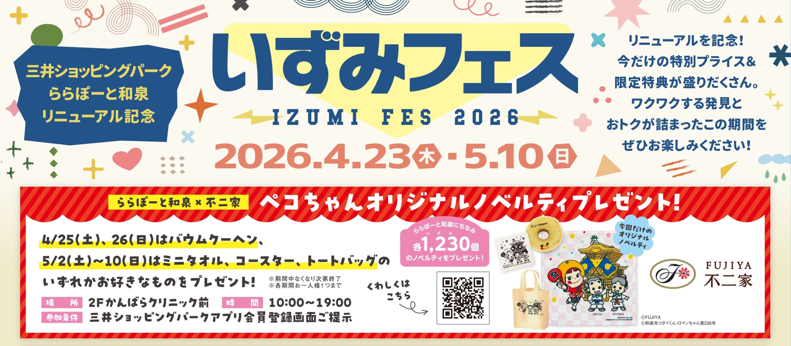 リニューアルを記念して、この春ららぽーと和泉にオープンする不二家とコラボを実施。不二家の人気キャラクター「ペコちゃん」と一緒に、和泉市イメージキャラクターのコダイくんとロマンちゃん、和泉みかん、だんじりなど和泉にゆかりのあるものが描かれた「ららぽーと和泉×ペコちゃん オリジナルノベルティ」を開発しました。三井ショッピングパークアプリの画面提示で、ららぽーと和泉×ペコちゃん オリジナルデザインのバウムクーヘン・ミニタオル・コースター・トートバッグいずれか1つをプレゼントします。