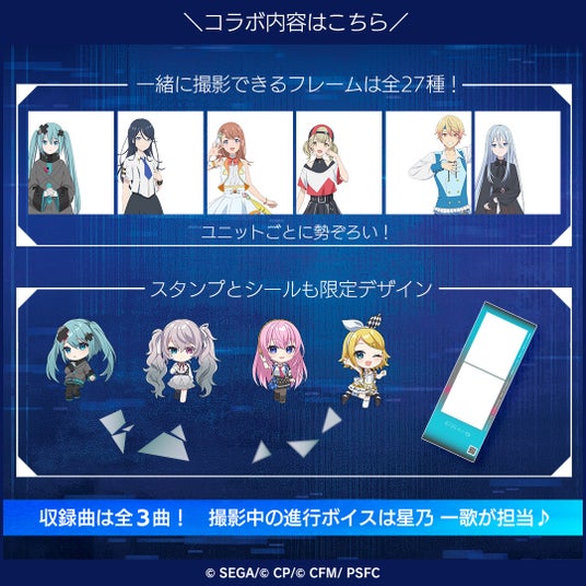 実施内容 :「劇場版プロジェクトセカイ 壊れたセカイと歌えないミク」コラボ限定の撮影フレーム全27種、スタンプ全29種、シールデザイン全1種、撮影中は星乃 一歌のボイスで進行するほか、プレイ中にBGMが全3曲聴けます。