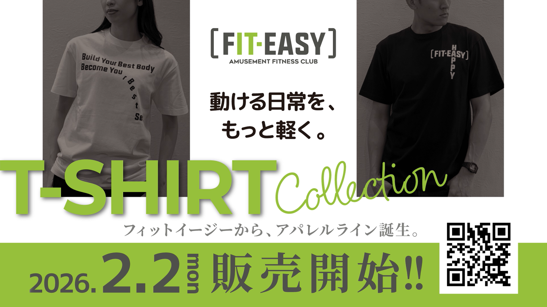 全国にアミューズメントフィットネスクラブを展開するフィットイージー株式会社(本社:岐阜市、以下:当社)は、「動ける日常を、もっと軽く」をコンセプトにオリジナルアパレル(Tシャツ)を開発し、2026年2月2日(月)正午より販売開始いたします。