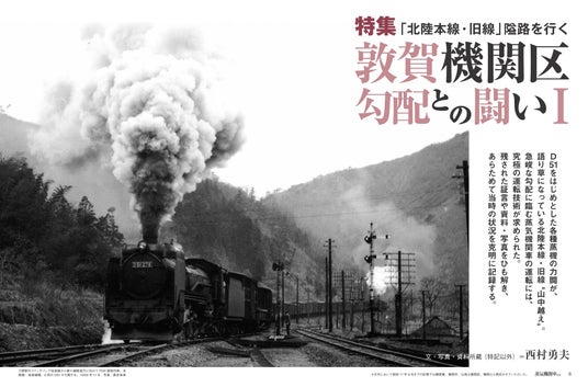 特集は「敦賀機関区勾配との闘いI」。急勾配と小径トンネルがつづき隘路であった北陸本線・旧線。柳ケ瀬越えや山中越えといった蒸機乗務員の苦闘を資料と写真、現場の声から検証する。著者は西村勇夫氏で、1回目となる今回はB6の時代からD51登場まで。