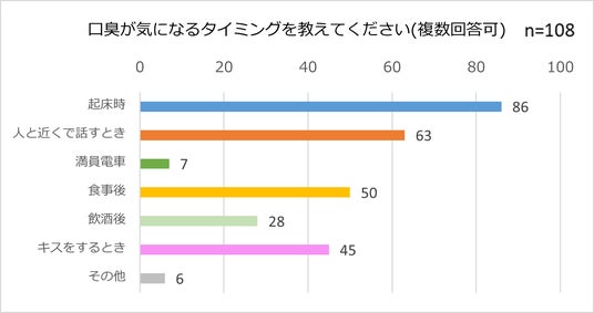 口臭が気になるタイミングは「起床時」が1番が多く、次いで、「人と近くで話すとき」「食事後」「キスをするとき」という回答が多い結果に。