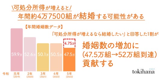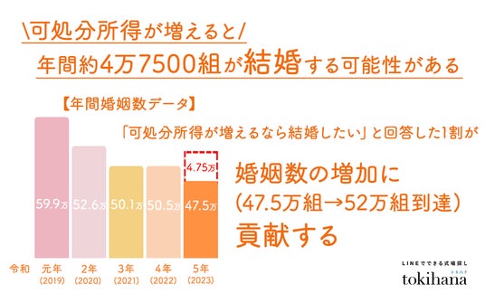 この課題に対し、トキハナは、「可処分所得が増えれば結婚したい」と考える約1割に注目し、その需要に応えることで、年間婚姻数を47.5万組から52万組へ回復させることができると見込んでいます。