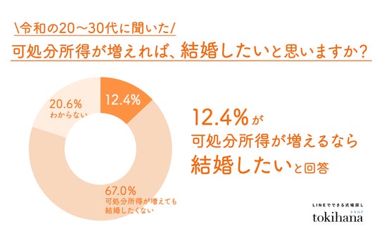 LINEでできる式場探し『トキハナ( https://tokihana.net/ )』を運営する株式会社トキハナ(本社:東京都港区、代表取締役社長:安藤 正樹、以下 「トキハナ」)は、インターネットリサーチによる20~30代の未婚の男女445人を対象とした調査の結果、「結婚したくない」と回答している人のうち、「可処分所得が増えれば、結婚したい」と考える人が12.4%いることが判明しました。